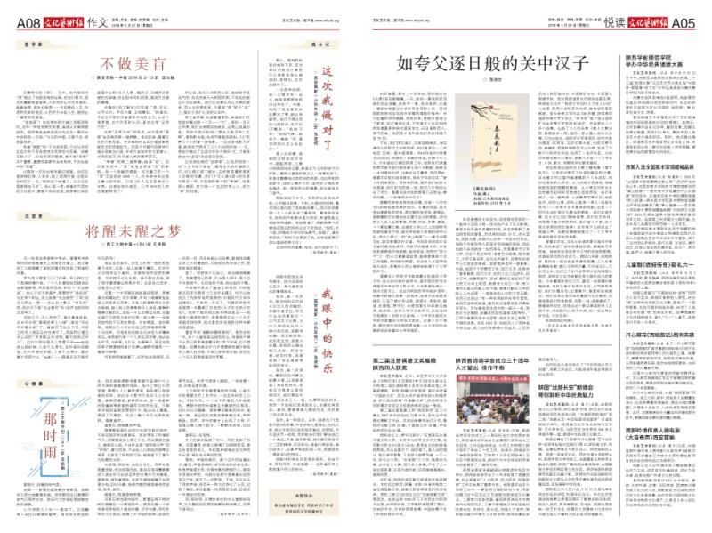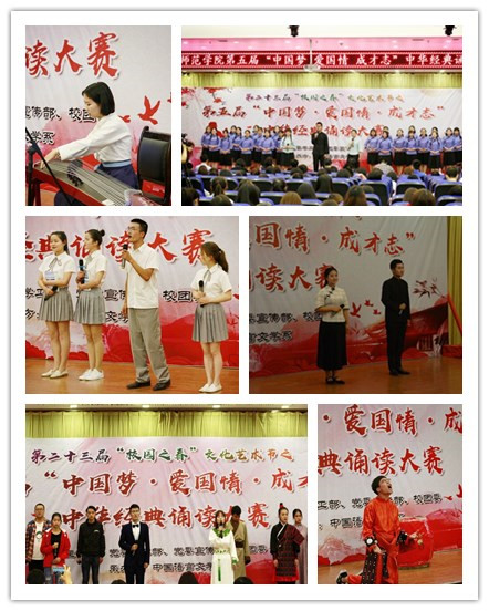 5月23日,由校学工部、宣传部、团委主办,中文系承办的第五届"中国梦·爱国情·成才志"中华经典诵读大赛总决赛在学校图书馆报告厅隆重举行。学校各相关职能部门负责人,相关院系党总支副书记、辅导员老师、媒体代表和学生代表400余人观看了比赛。大赛还特别邀请了陕西人民广播电台著名主持人海茵老师担任点评嘉宾。