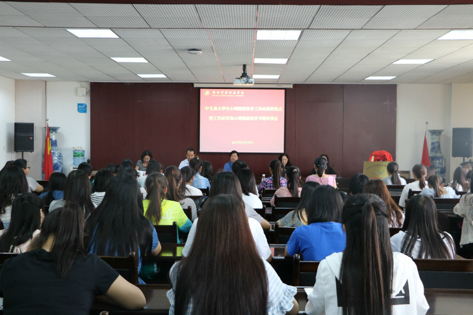 2017年5月19日下午,中文系在行政楼第五会议室举行大学生心理健康教育工作站揭牌仪式暨工作站成立后首场心理健康教育专题培训会,学校学工部部长史保怀教授、中文系党总支副书记杨阳、学校大学生心理健康与指导中心主任李菁、中文系辅导员、全体心理委员和宿舍舍长共计100余人参加了此次会议,会议由中文系党总支副书记孔养涛主持。